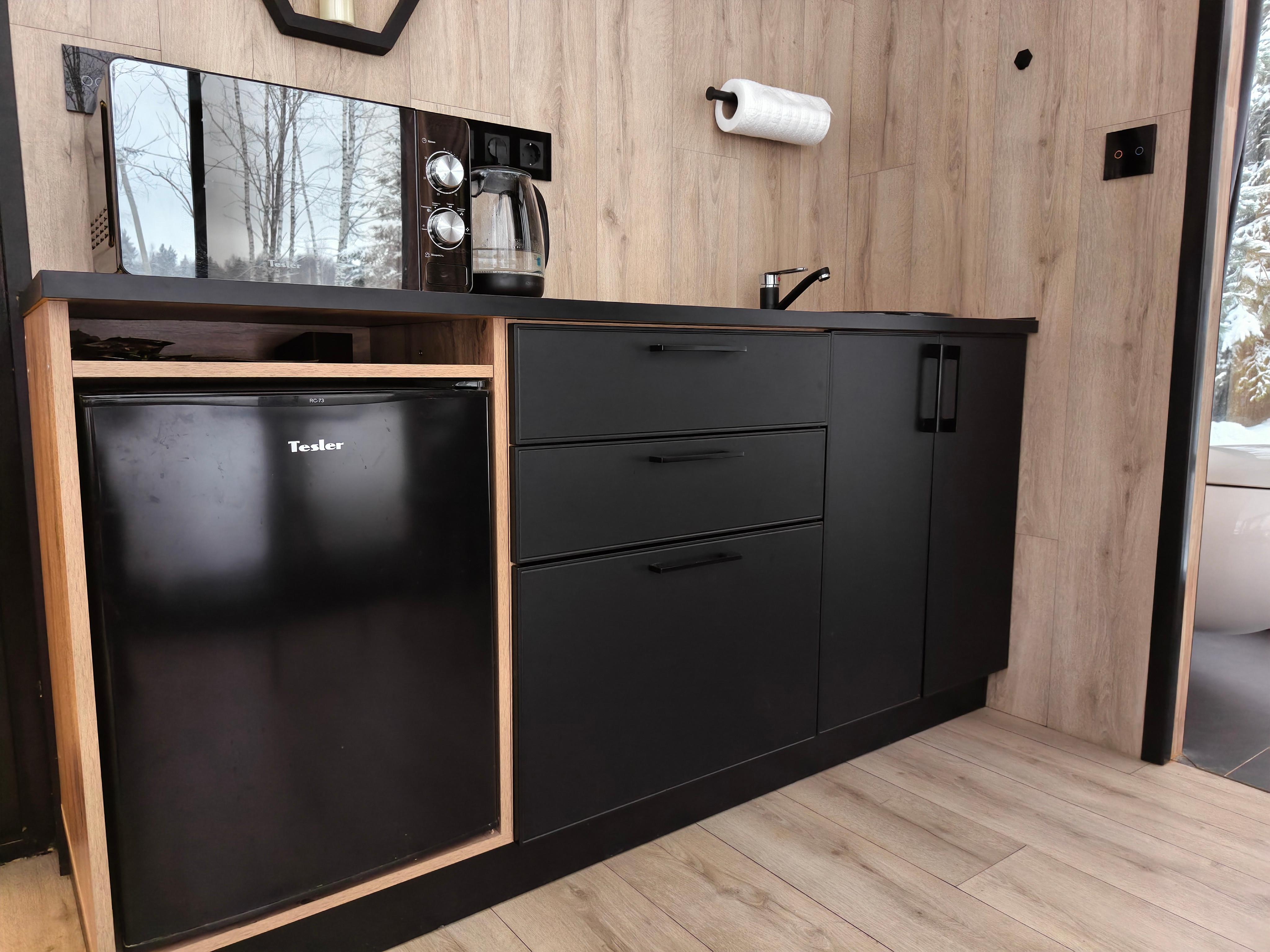 Наша кухня оснащена всем необходимым набором посуды и техники, для комфортного проживания вдвоем. Внимание!!! В доме отсутствует плита. Для приготовления блюд можно воспользоваться мангальной зоной либо разогреть еду в микроволновой печи.